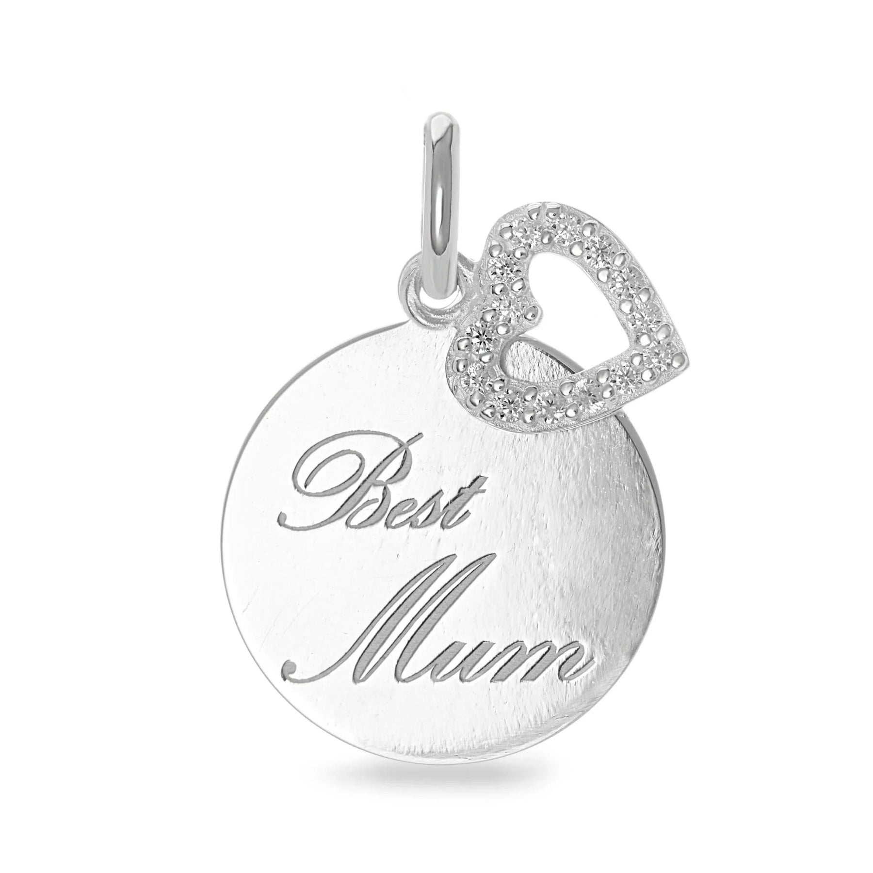 Silver Best Mum Pendant Necklace. Each necklace is crafted from sterling silver with a cubic zirconia heart for added sparkle and elegance.