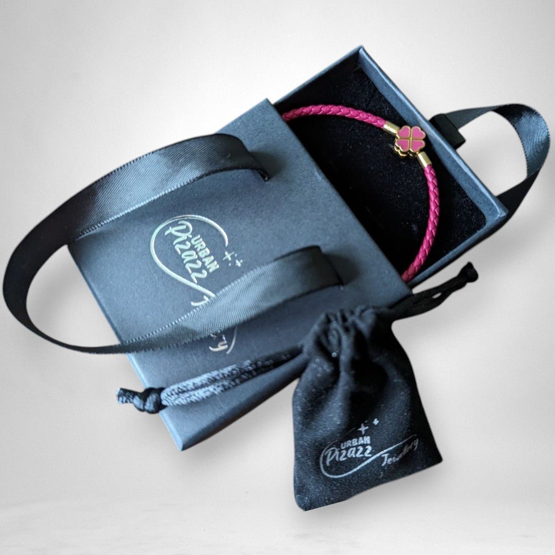 Our Rose Pink Leather Clover Leaf Charm Bracelet. Made from real cow hide and held together with a clover shaped stainless steel clasp layered with 18ct gold plated.