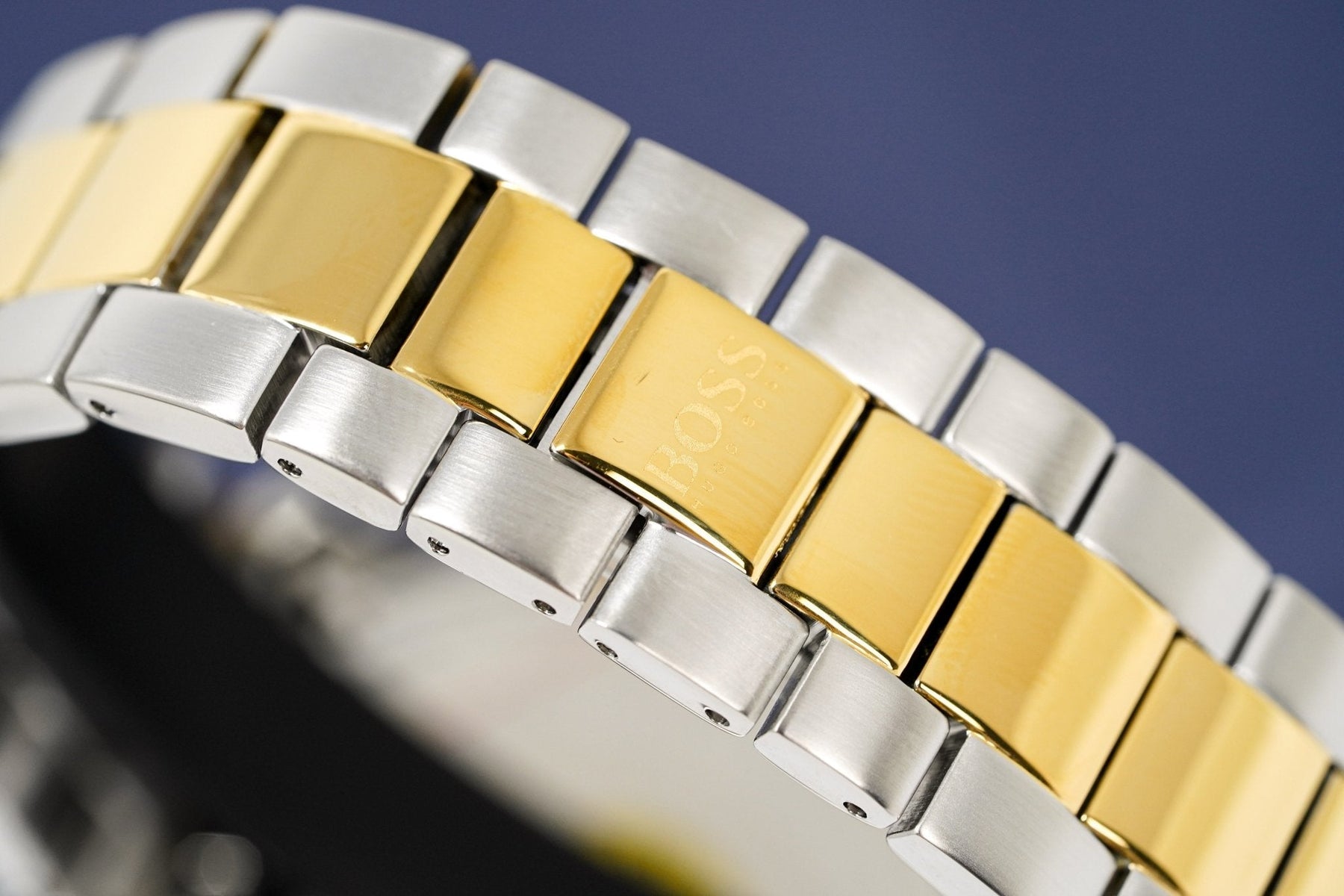 Two Tone Yellow Gold PVD Plated/Stainless Steel Bracelet with Push Button Deployment Clasp.