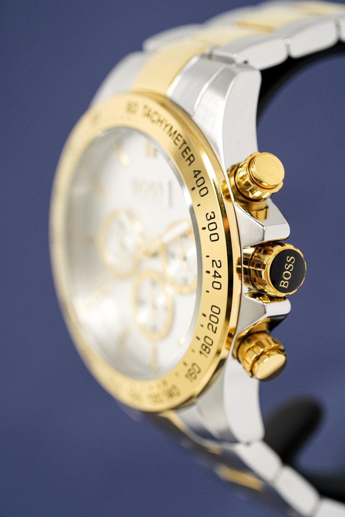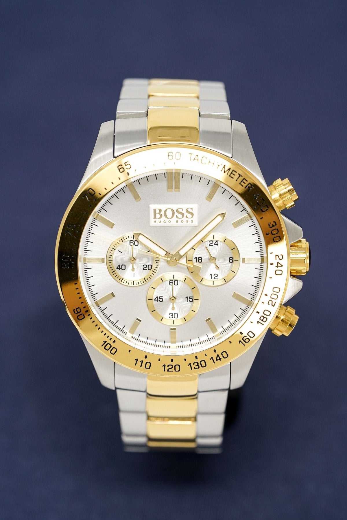 44mm Stainless Steel Case. Scratch Resistant Mineral Crystal. Yellow Gold PVD Plated Steel Tachymeter Bezel.