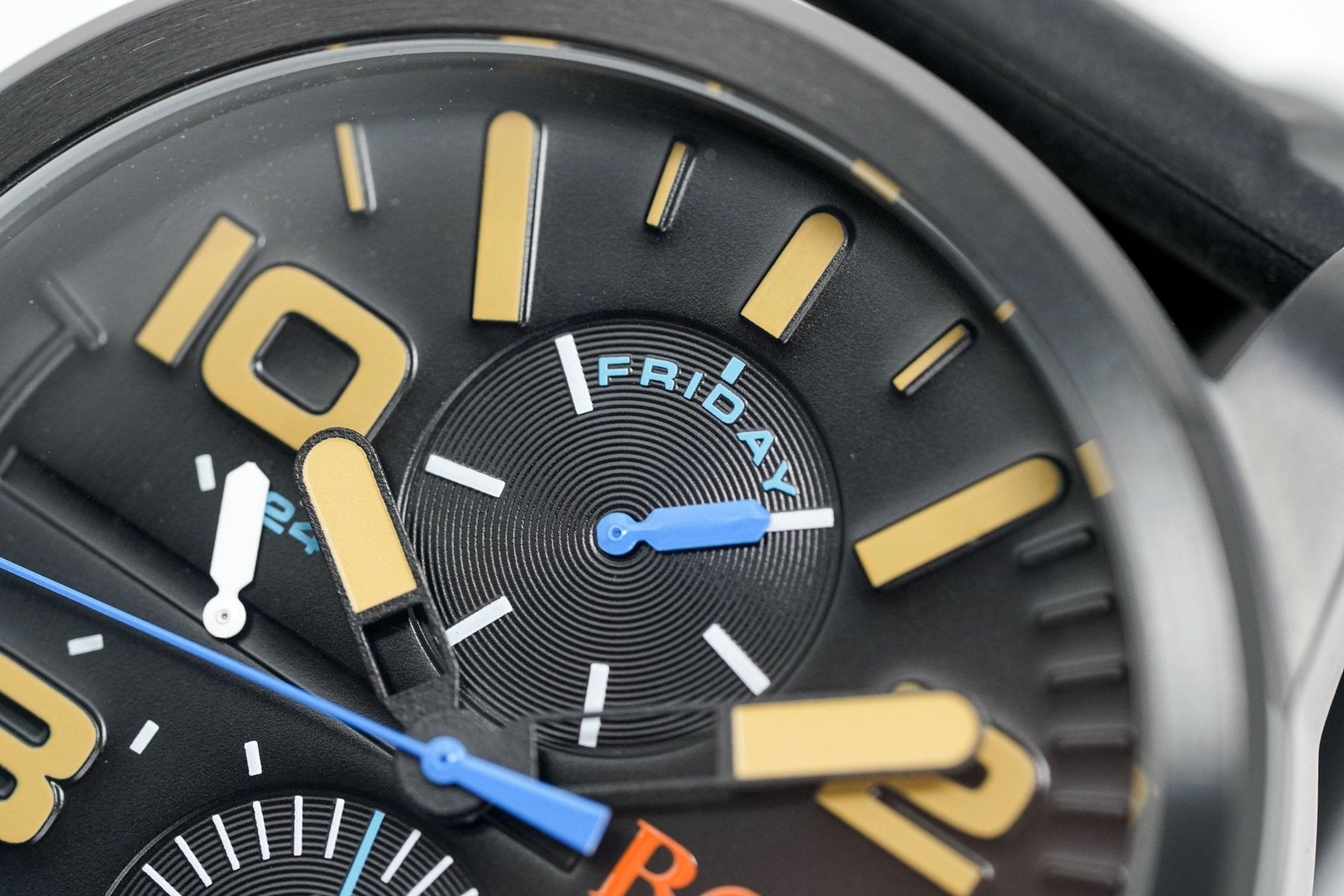 Black Dial. Luminous Steel Hands. Orange Markers. Date On Subdial.