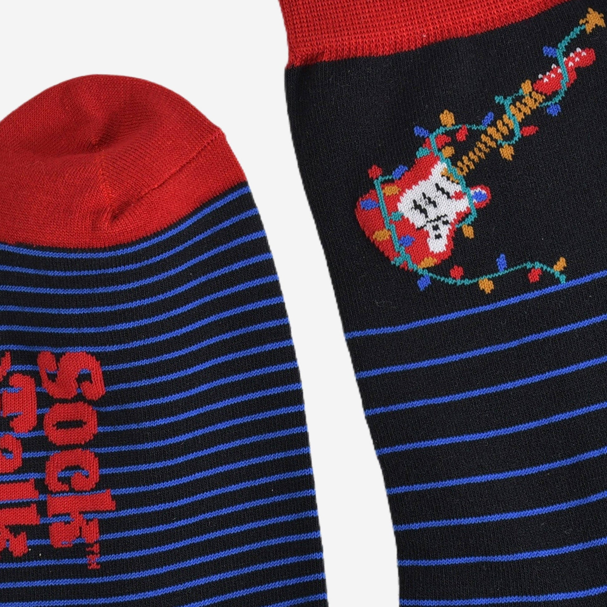 💝 PERFECT FOR Gift for him, party socks, music lover 🧦 THIS PIECE Designed in the UK, these festive-inspired socks are crafted from eco-friendly sustainable bamboo. Showcasing an electric guitar and festive Christmas lights. These striped dress socks feel luxuriously soft. Â 🧵 FABRIC Crafted from antibacterial, antifungal, hypoallergenic, and thermo-regulating bamboo fabric. The fabric feels soft and breathable on the skin. 70% Bamboo, 27% Polyester, 3% Elastane Delicate machine wash